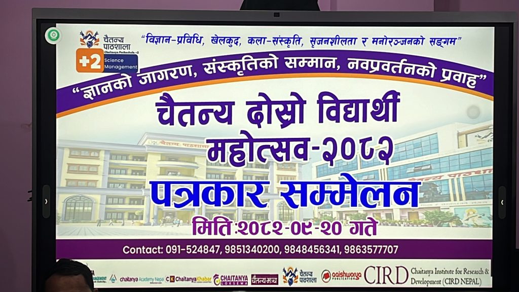 धनगढी- शिक्षा र संस्कारको संगमलाई जोड दिँदै आएको चैतन्य पाठशालाले आगामी पुस २२ गतेदेखि ‘चैतन्य दोस्रो विद्यार्थी महोत्सव – २०८२’ आयोजना गर्ने भएको छ। विद्यालयले आइतबार एक प्रेस मिटमार्फत “ज्ञानको जागरण, संस्कृतिको सम्मान, नवप्रवर्तनको प्रवाह” भन्ने मूल नाराका साथ महोत्सवको घोषणा गरेको हो।